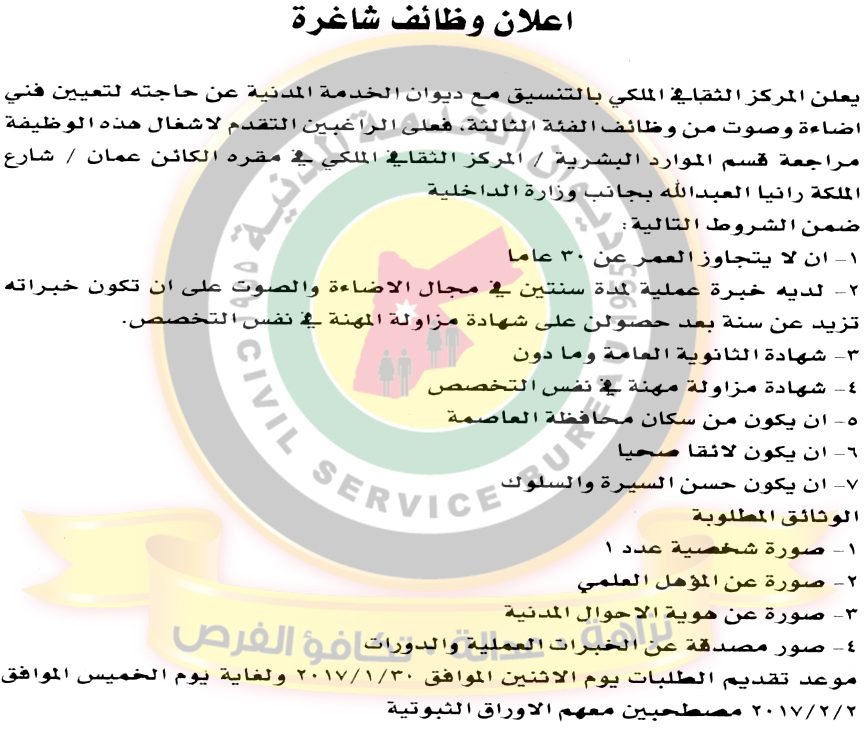 اعلان وظائف شاغرة صادر عن المركز الثقافي الملكي تصفّح المقالات مطلوب موظفين من كلا الجنسين لشركة في التخصصات التالية مطلوب مدربين كافة التخصصات للعمل لدى اكاديمية