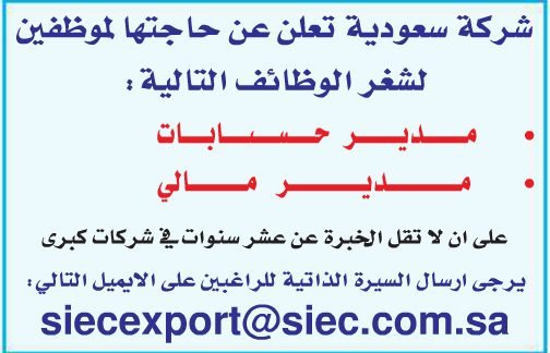 شركة سعودية في الأردن تعلن عن حاجتها لموظفين في تخصصات المحاسبة والمالية تصفّح المقالات وظائف شاغرة لدى شركة جنان الاردن في مجال المحاسبة مطلوب محاسب للعمل لدى شركة صناعية كبرى