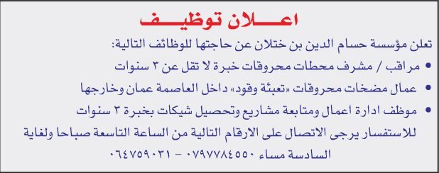 محطة محروقات مرموقة في عمان تطلب كادر موظفين للعمل لديها تصفّح المقالات 15 وظيفة شاغرة في الهلال الاحمر الاردني – لمزيد من المعلومات اضغط هنا مطلوب موظفين في محل شوكولاتة وحلويات من كلا الجنسني