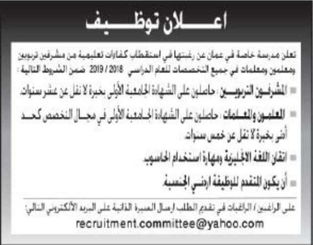 تعلن مدرسة خاصة في عمان عن رغبتها في استقطاب كفاءات تعليمية من جميع التخصصات للعام الدراسي 2018 – 2019 تصفّح المقالات وظائف شاغرة في التخصصات التالية لدى روضة ومدرسة المهارات الدولية وظائف شاغره لدى مدارس مرموقة
