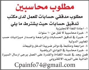 مطلوب محاسبين للعمل لدى شركة كبرى تصفّح المقالات مطلوب رئيس قسم محاسبة لشركة صناعية كبرى مطلوب محاسب للعمل لدى شركة مقاولات
