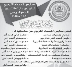 وظائف شاغرة لدى مدارس الحصاد التربوي بتخصصات التالية