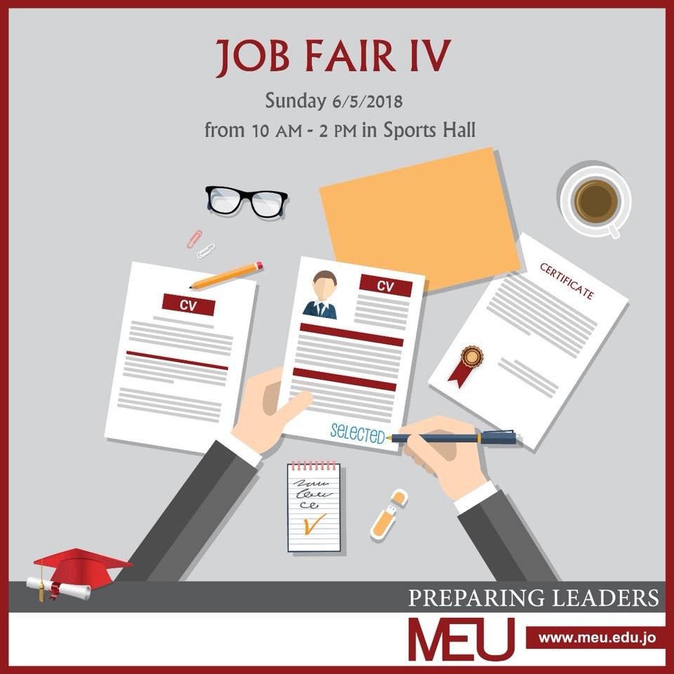 جامعة MEU وبرعاية وزير العمل وفرتلك 120 وظيفة من خلال اليوم الوظيفي الرابع وبحضور اكثر من 40 شركة محلية وعالمية وكمان رح يكون في ورشة عمل حول مهارات كتابة CV ومقابلات العمل وقانون العمل والعمال الاردني.