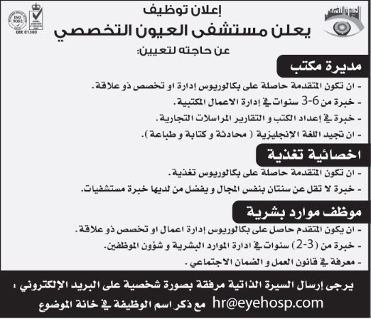 وظائف شاغرة لدى مستشفى العيون التخصصي في قسم الموارد البشرية تصفّح المقالات وظيفة شاغرة لدى شركة براتب 400 دينار وتأمين ومواصلات وظائف شاغرة في مطار الملكه علياء