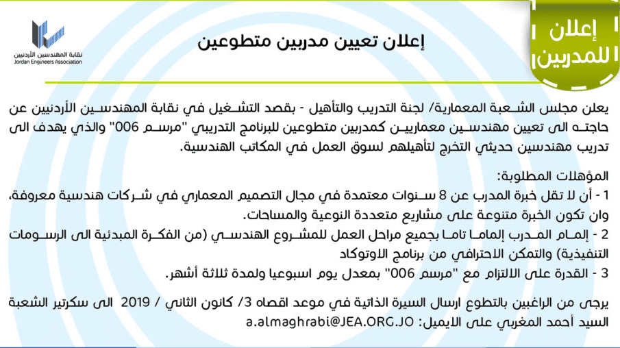 وظائف شاغرة لدى نقابة المهندسين ومرحب بحديثي التخرج تصفّح المقالات مطلوب للعمل لدى شركة هندسية مرحب بحديثي التخرج وظائف شاغرة لدى الجمعية الاردنية للاسعاف في التخصصات التالية