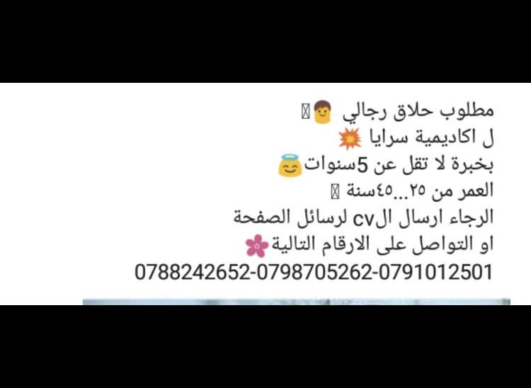 مطلوب حلاق رجالي التفاصيل بالاعلان تصفّح المقالات وظائف شاغرة في المحاماة لمكتب المحاماة وظئف شاغرة لدى مجمع فرح في اكثر من تخصص سائقين طب تمريض وغيرها