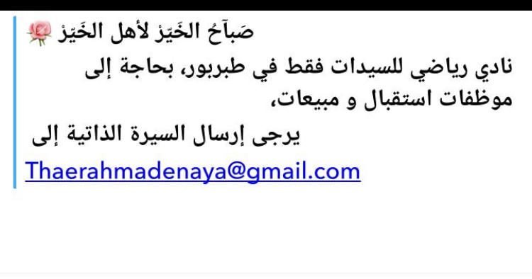فرص عمل في اقسام الاستقبال و المبيعات لنادي رياضي