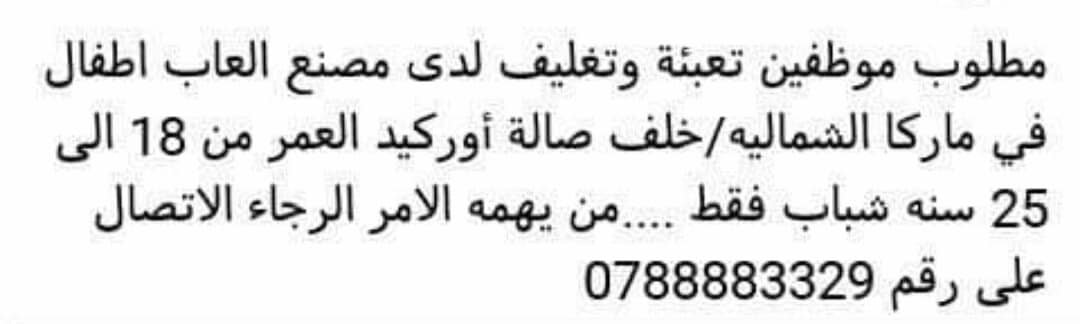 مطلوب عمال من عمر 18 الى 25 للعمل لدى مصنع تصفّح المقالات مطلوب مشرفين و عمال نظافة من كلا الجنسين مطلوب موظفين للعمل لدى شركة خدمات هجرة في الصويفية
