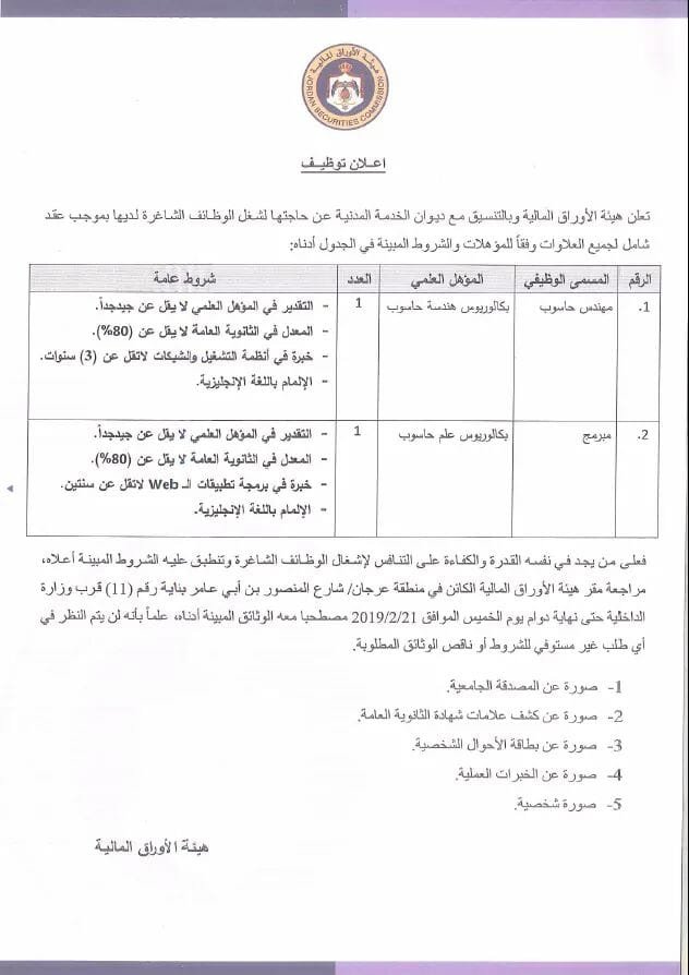 وظائف شاغرة لدى هيئة الاوراق المالية