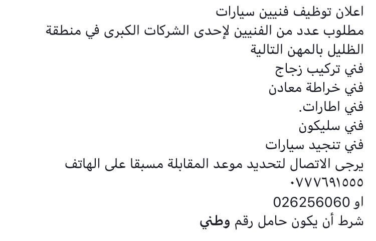 مطلوب عدد من الفنيين للعمل لدى شركة سيارات كبرى تصفّح المقالات مطلوب فوا شباب للعمل في فنادق خمس نجوم شرط ان يكون.. مطلوب عدد من الموظفات لدى عيادة تجميلية كالتالي: