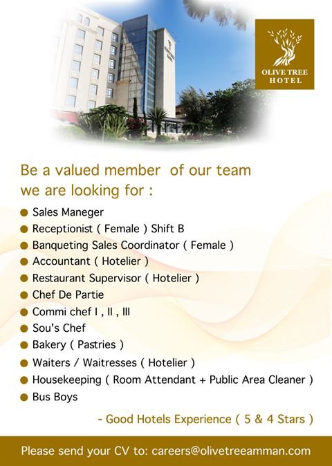 وظائف شاغرة لدى فندق Olive Tree Amman