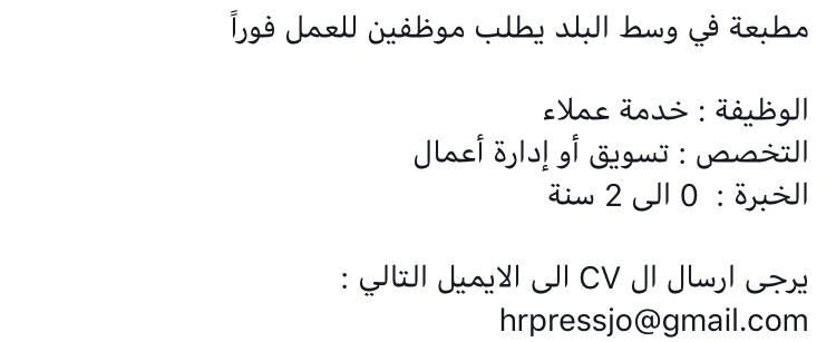 مطلوب موظفي خدمة عملاء -مرحب بحديثي التخرج تصفّح المقالات وظائف شاغرة لدى مطاعم ورد مطلوب مسؤول لمستودع ملابس -كلا الجنسين راتب 280 دينار
