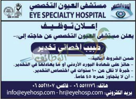 وظائف شاغرة لدى مستشفى العيون التخصصي