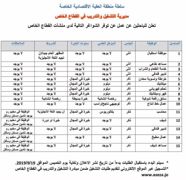 تعلن سلطة منطقة العقبة الاقتصادية الخاصة بالتعاون مع مديرية التشغيل والتدريب عن توفر الشواغر التالية و لكلا الجنسين