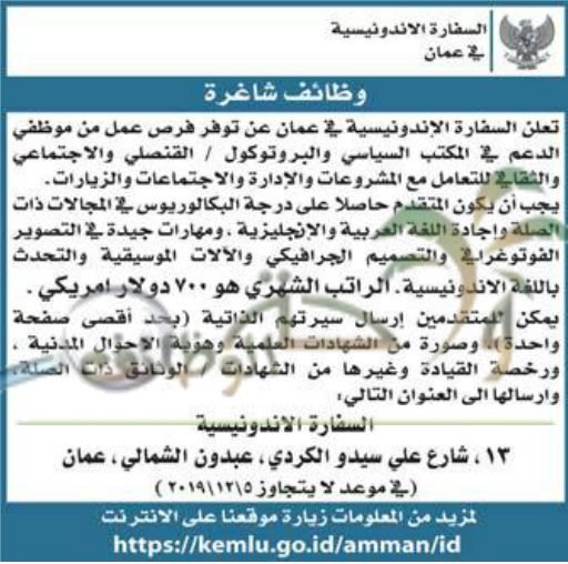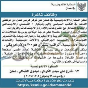 وظائف شاغرة لدى السفارة الاندونسية براتب 700 دينار