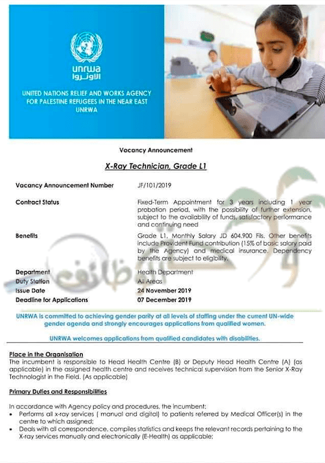 اعلان توظيف صادر عن الانروا براتب ٦٠٤ دينار – التقديم للذكور والإناث