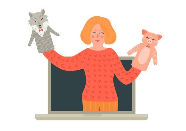 Online puppet theatre show. Woman on laptop screen tells folk fairy-tale about wolf and pig. Distance children entertainment.