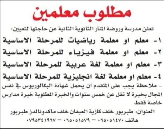 مدرسة في طبربور بحاجة لمعملين في عدة تخصصات