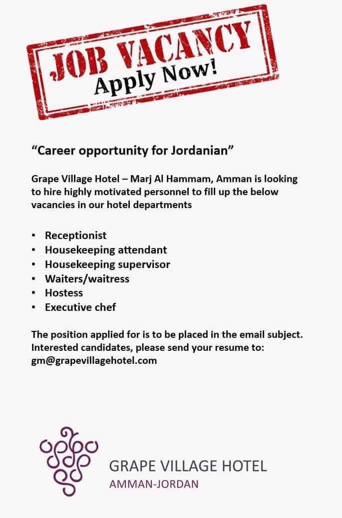 اعلان صادر عن شركة الشقق الفندقية للراغبين بالتقدم ارسال السيرة الذاتية الىGm@grapevillagehotel.com تصفّح المقالات مطلوب موظفين ميكانيك و موظفين امن عام و دفاع مدني للعمل في شركة مطلوب موظفين مبيعات للعمل لدى شركة كبرى بعمان براتب 450-650