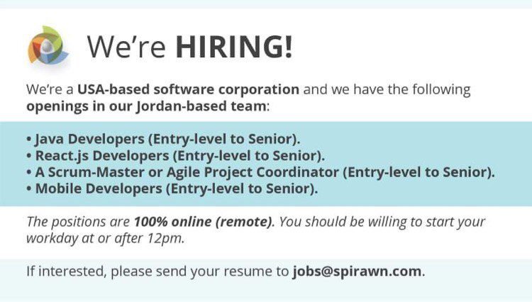 Were usa based software cooperation and we have the following openings in our jordan based team