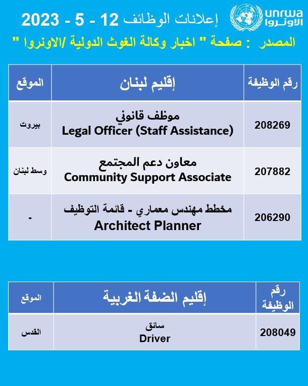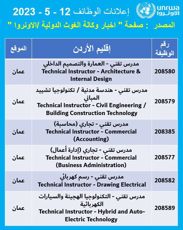 إعلانات الوظائف المتوفرة بالأونروا لهذا اليوم 12 – 5 – 2023
