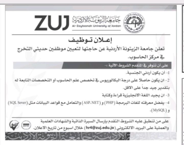 تعلن جامعة الزيتونة الأردنية عن حاجتها لتعيين موظفين حديثي التخرج في مركز الحاسوب، على أن تتوفر في المتقدم الشروط الآتية