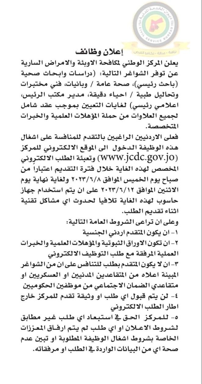 يعلن المركز الوطني لمكافحة الاوبئة والامراض السارية عن توفر الشواغر التالية لغايات التعيين بموجب عقد شامل لجميع العلاوات من حملة المؤهلات العلمية والخبرات المتخصصة.