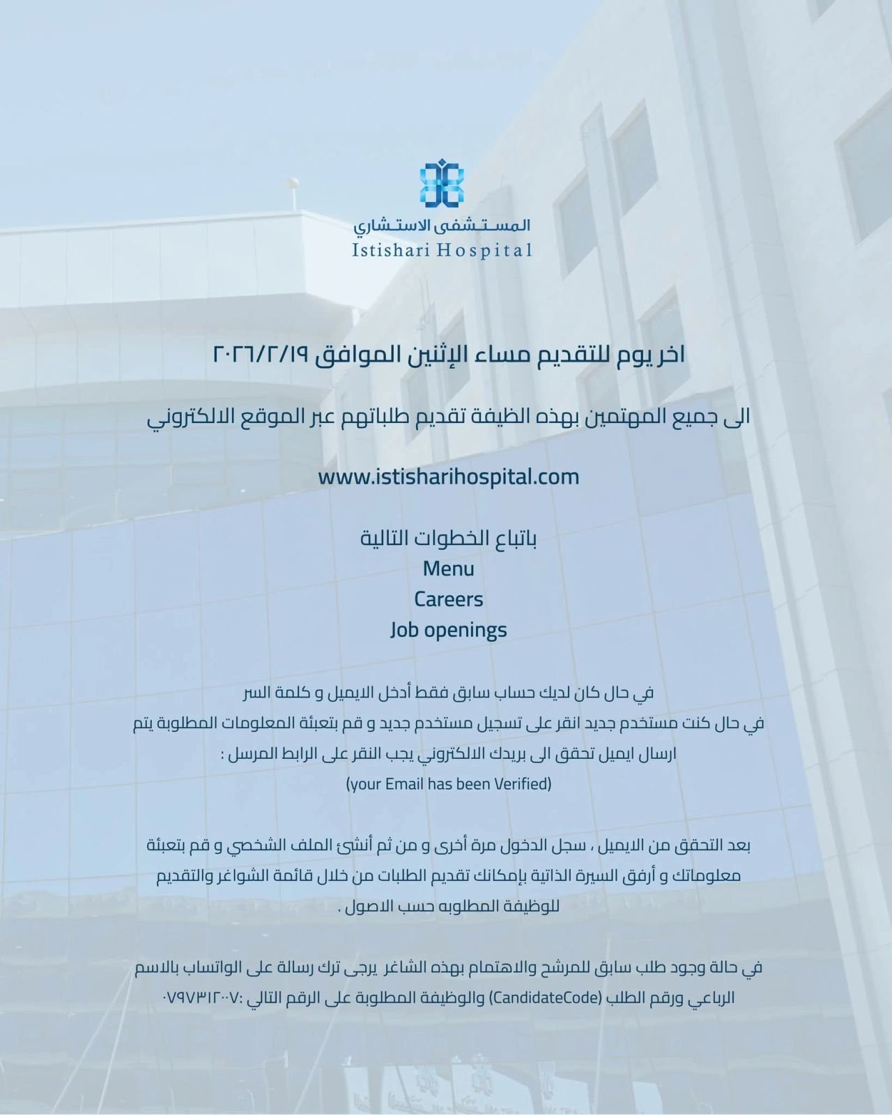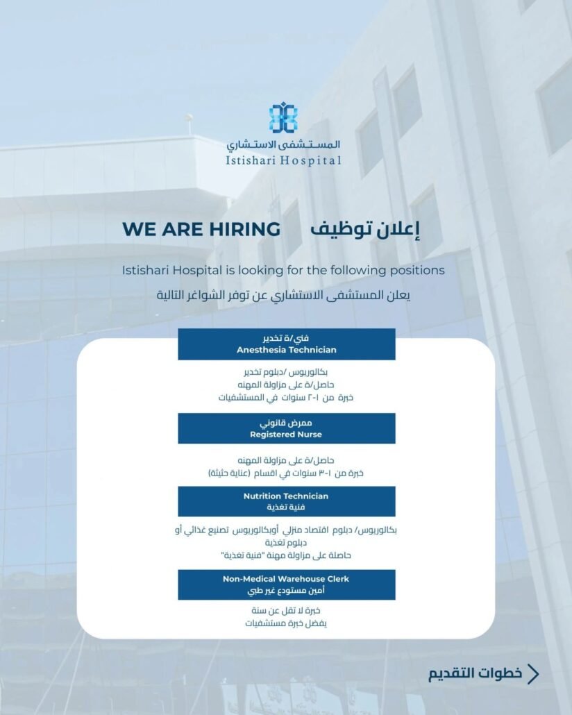 يعلن المستشفى الاستشاري عن توافر الشواغر التالية:
