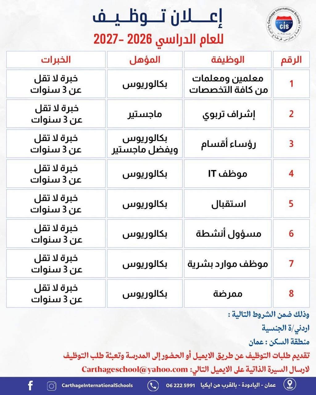 تعلن روضة ومدارس قرطاج الدولية عن حاجتها للشواغر الآتيه للعام الدراسي القادم (2026-2027).
