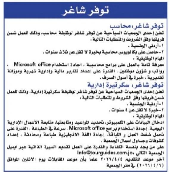 تعلن إحدى الجمعيات السياحيت عن حاجتها لتعيين الشواغر التالية1-محاسب2-سكرتيرة_ادارية تصفّح المقالات إعلان وظائف شاغرة – السفارة السويسرية في عمّان