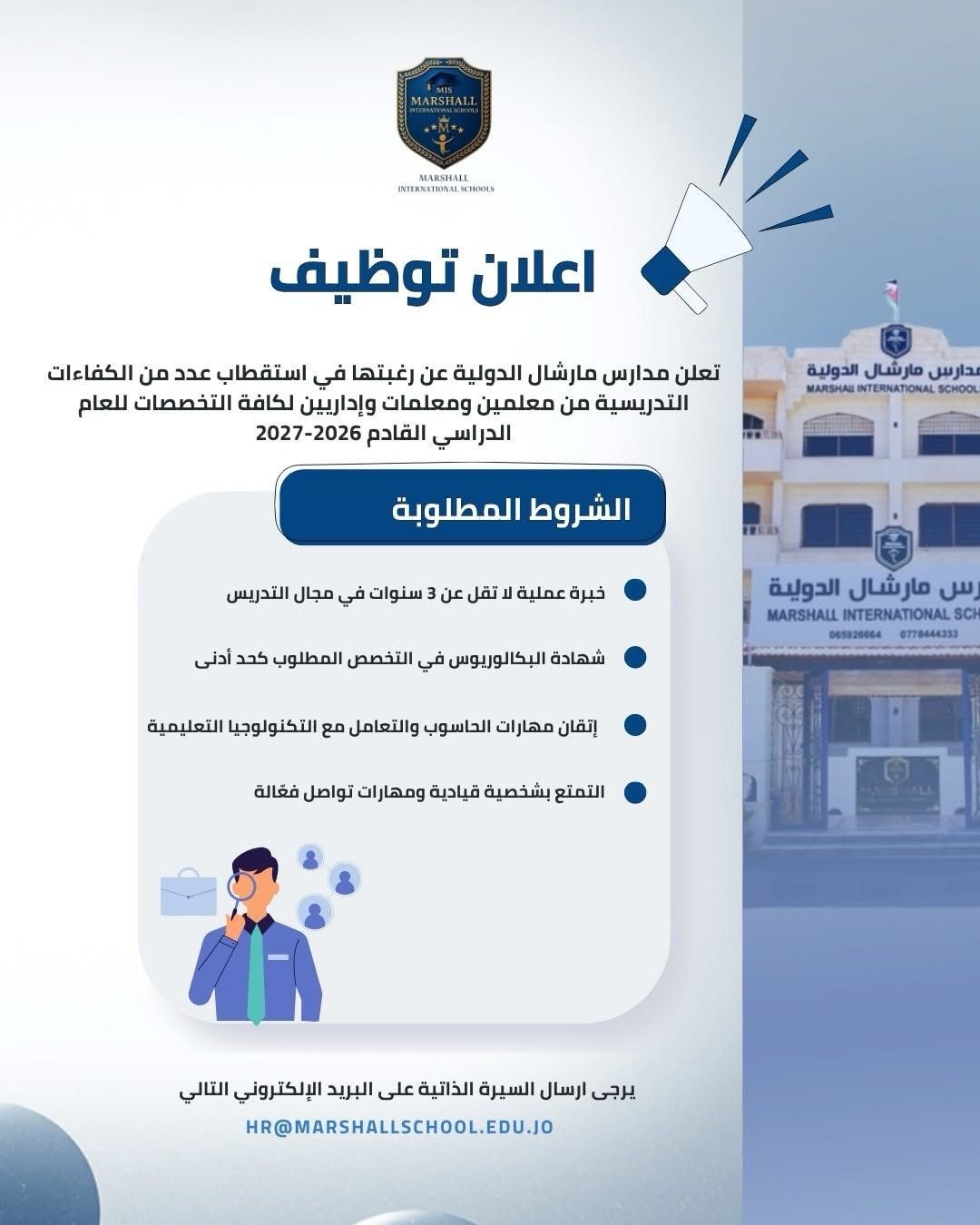 تعلن مدارس مارشال الدولية عن رغبتها في استقطاب عدد من الكفاءات التدريسية من معلمين ومعلمات وإداريين في التخصصات المختلفة للعام الدراسي القادم 2026-2027، وذلك بالشروط الآتية: