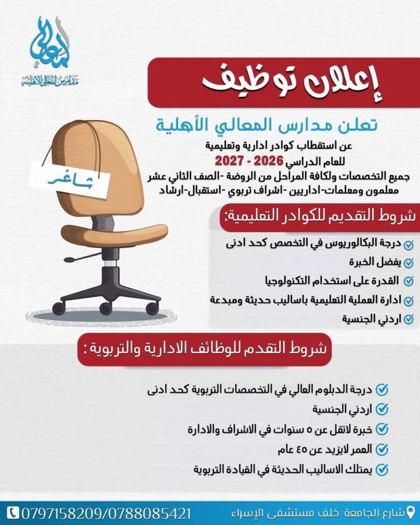 تعلن مدارس المعالي الأهلية عن حاجتها لكوادر تعليمية وإدارية للعام الدراسي 𝟮𝟬𝟮𝟲–𝟮𝟬𝟮𝟳 لجميع المراحل والتخصصات.