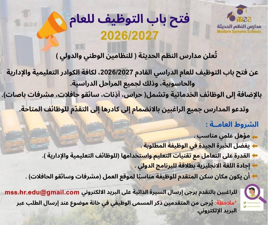 تعلن مدارس النظم الحديثة عن فتح باب التوظيف للعام الدراسي 2026/2027
